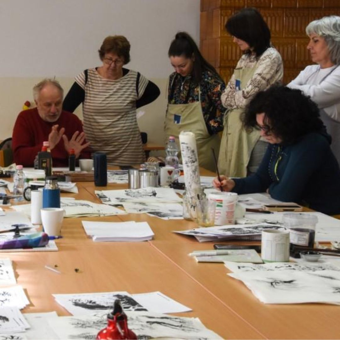Festünk kínai tussal és kínai akvarellel rizspapírra és Fabriano 300g akvarell papírra. Az elmélyült alkotás mellett a kínai festészettörténetbe is betekintést kapunk Horváth Janisz előadásain keresztül.